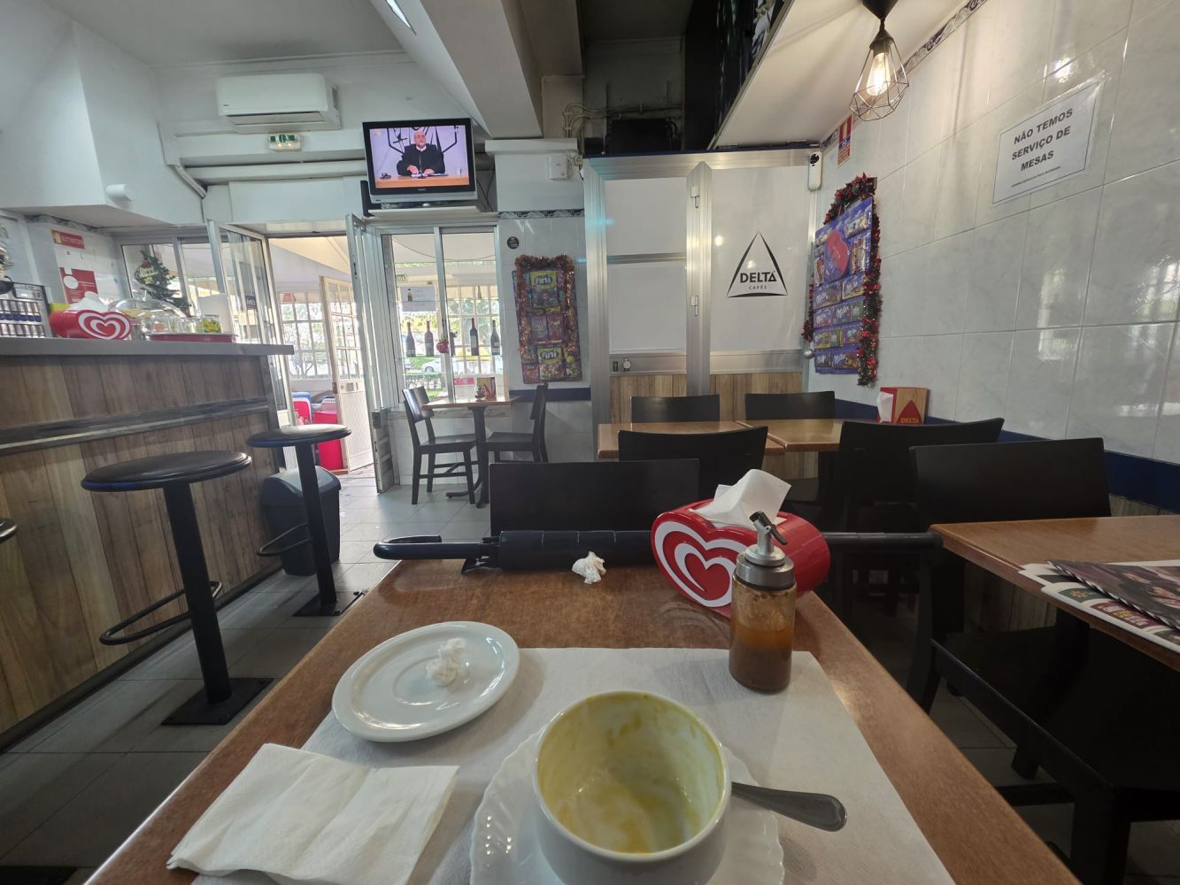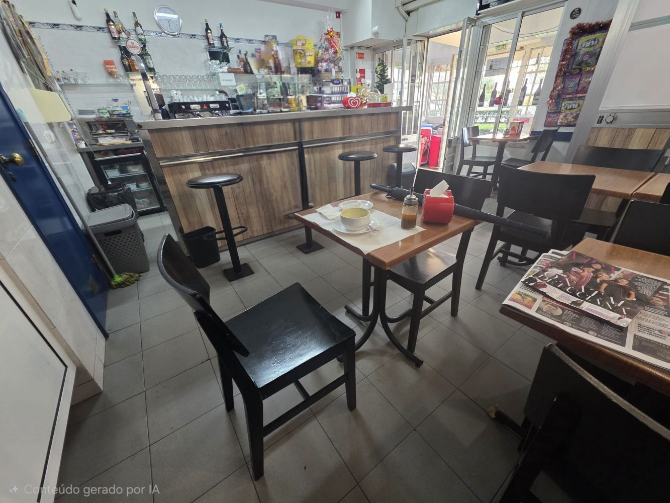 Sala principal com ambiente acolhedor e zona de cafetaria