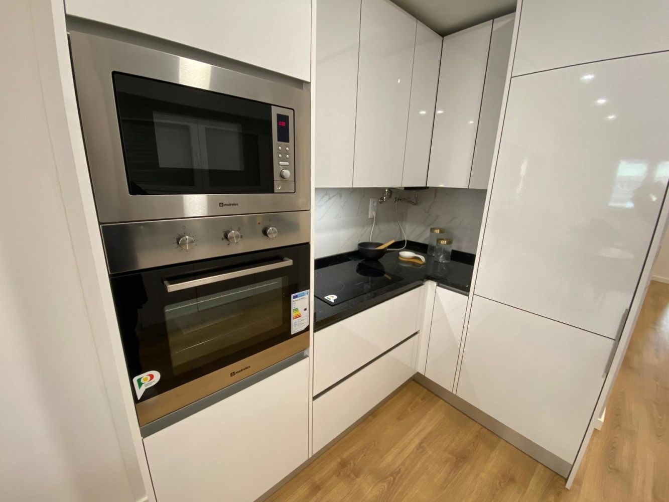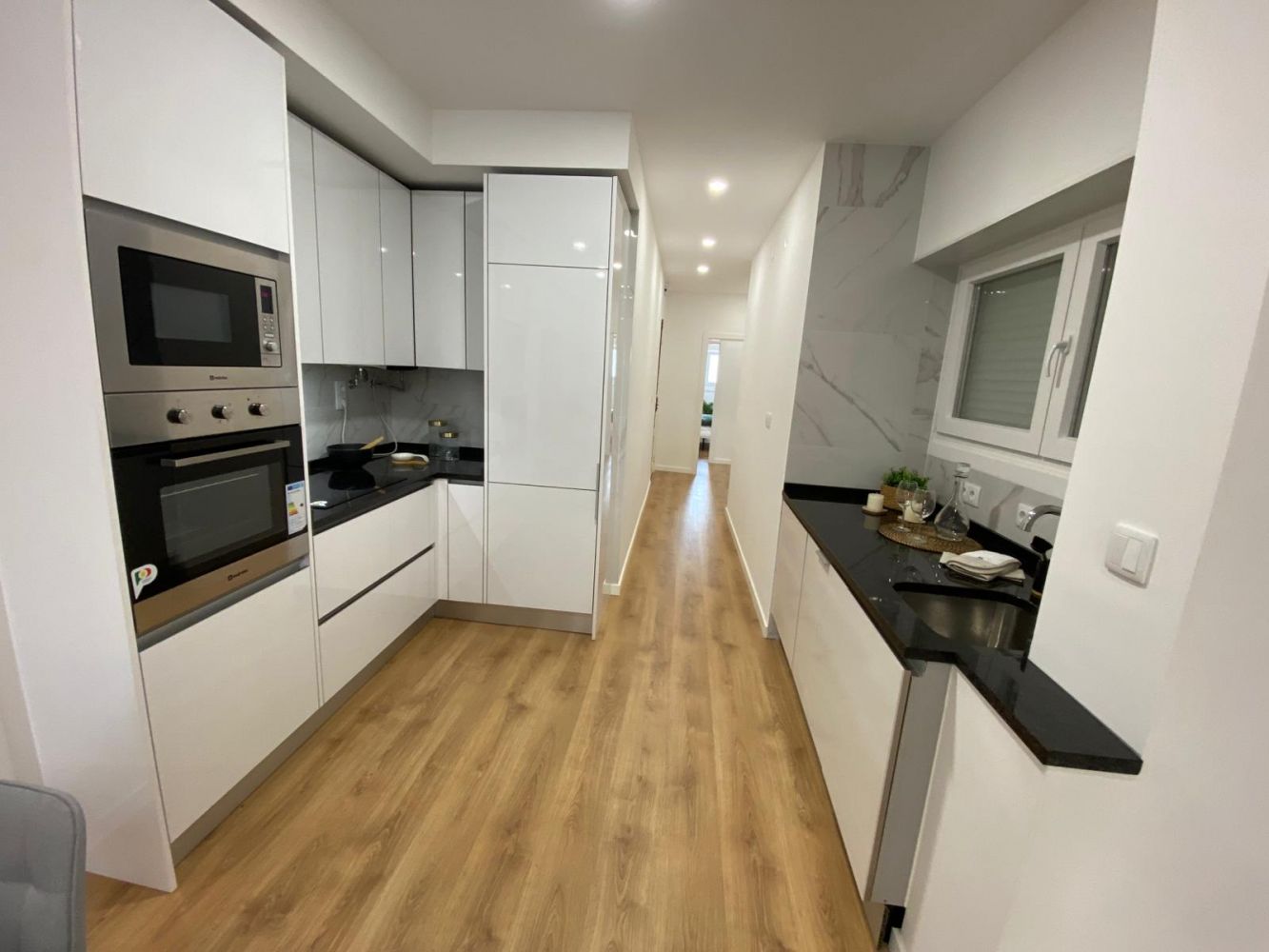 Cozinha + Sala c/ 30m2. A cozinha tem móveis em Branco; Ladrilho em toda a parede por trás dos móveis; Forno, Placa, Exaustor, Micro-ondas, Máquina de lavar louça encastrada, Máquina de lavar roupa encastrada, Termo Acumulador e Combinado encastrado; Hall c/ 5m2; Wc completo c/ 5m2 com Loiças suspensas; 3 Quartos, o Primeiro c/ 12m2 e Roupeiro, o Segundo c/ 16m2 e Roupeiro e a Terceira Suíte c/ 20m2.