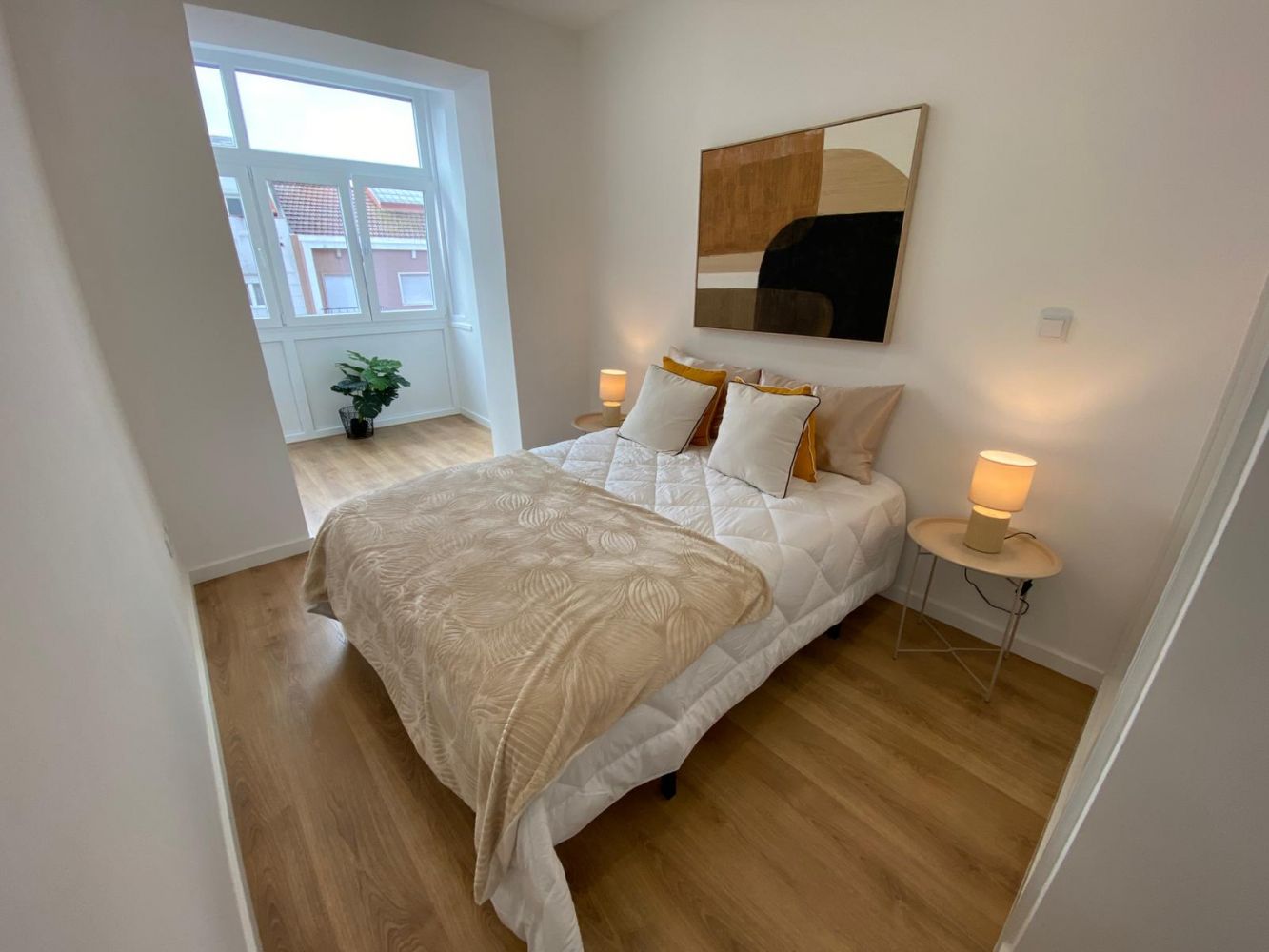 Caixilharia lacada a branco com vidros duplos e Oscilo Batentes em todas as assoalhadas. Teto falso com luzes embutidas leds, nos WCs, Cozinha, Sala, Hall e Quartos.