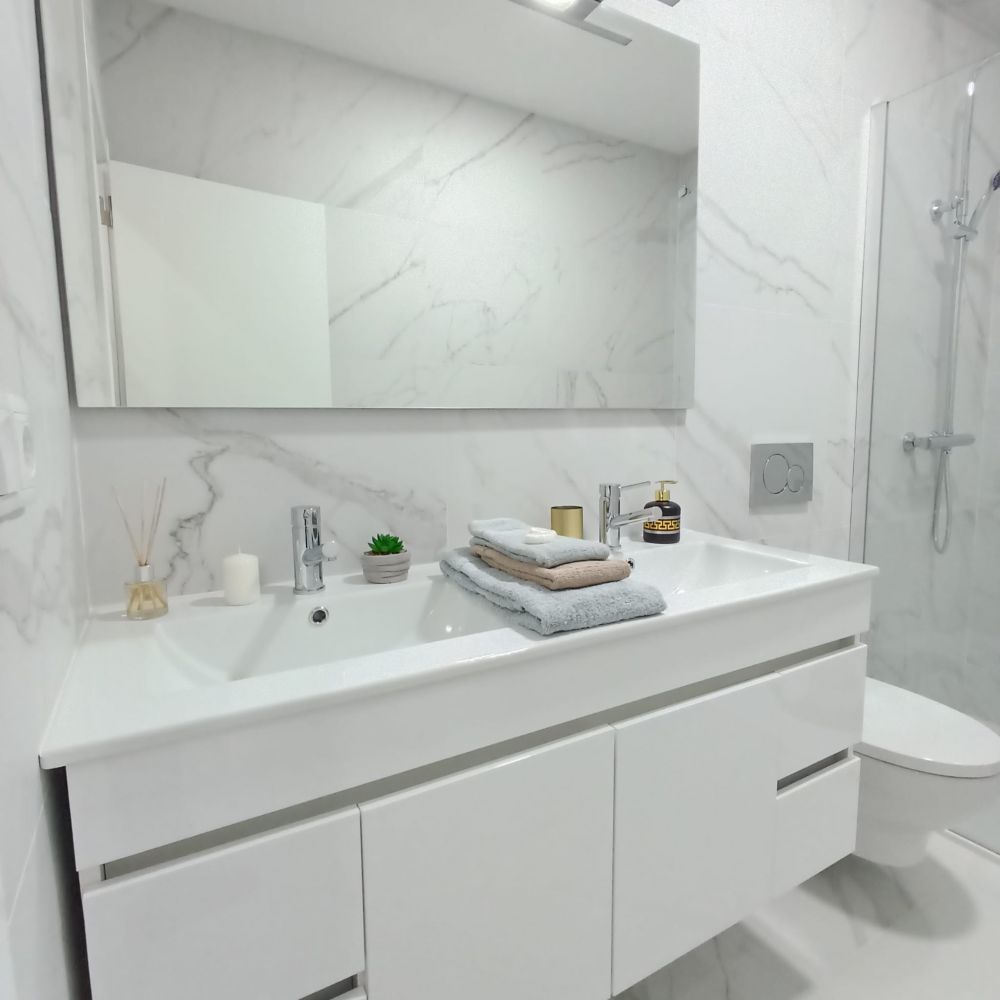 Caixilharia lacada a branco com vidros duplos e Oscilo Batentes em todas as assoalhadas. Teto falso com luzes embutidas leds, nos WCs, Cozinha, Sala, Hall e Quartos.